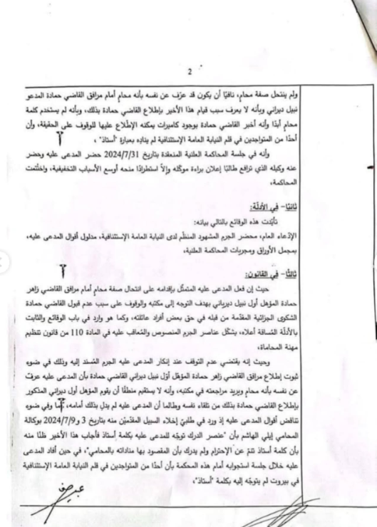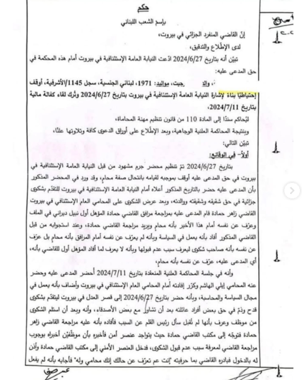 وجاء في متن الحكم انه تم تنظيم محضر جرم مشهود من قبل النيابة العامة الاستئنافية في بيروت في حق المدعى عليه أوقف بموجبه لقيامه بانتحال صفة محام، وقد ورد في المحضر المذكور أن المدعى عليه حضر أمام النيابة العامة الاستئنافية في بيروت للتقدم بشكوى جزائية في حق شقيقه وشقيقته ووالدته، وبعد عرض الشكوى على المحامي العام الاستئنافي في بيروت القاضي زاهر حمادة، قام المدعى عليه بمراجعة مرافق القاضي حمادة المؤهل أول نبيل ديراني في الملف وعرّف عن نفسه أمام هذا الأخير بأنه محام ويريد مراجعة القاضي حمادة، وعند استجوابه من قبل القاضي المذكور أفاد بأنه يعمل في السياسة وبأنه لم يعرّف عن نفسه أمام المرافق بأنه محام بل عرّف عن نفسه بأنه صاحب شكوى ليعرف سبب عدم قبولها وبأنه لا يعرف لماذا أفاد المؤهل أول القاضي بأنه، أي المدعى عليه، عرّف عن نفسه بأنه محام.