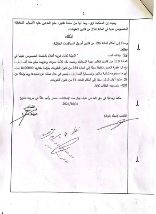 “سنداً الى أحكام المادة 196 من قانون أصول المحاكمات الجزائية، يُحكم بإدانة المدعى عليه بالجنحة المنصوص عليها في المادة 110 من قانون تنظيم مهنة المحاماة وحبسه مدة ثلاث سنوات وتغريمه مبلغ مئة ألف ل.ل، وإبدال عقوبة الحبس تخفيفاً سنداً الى المادة 254 من قانون العقوبات بغرامة مقدارها ثمانية ملايين وخمسماية ألف ل.ل، على أن يُحبس في حال تخلفه عن تسديدها يوما واحدا عن كل عشرة الآف ل.ل سندا الى أحكام المادة 54 من قانون العقوبات، وبتضمينه النفقات كافة”.